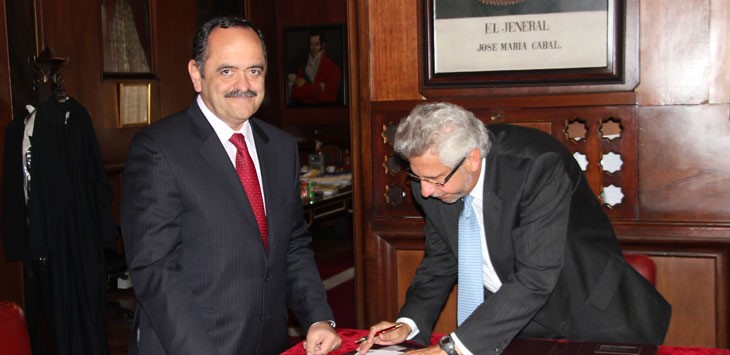 de Iz a Der el Presidente del Fondo Nacional del Ahorro, Ricardo Arias Mora y el Rector de la Universidad del Rosario Hans Peter Knudsen Quevedo firmaron un convenio de cooperación para que todos los empleados y estudiantes de la universidad puedan acceder al portafolio del FNA. Foto: Martha Correal.