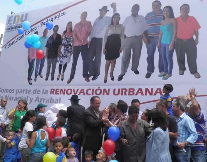 Tras la firma de la fiducia, que permitirá financiar los proyectos de Arrabal y Naranjal en Medellín, el Presidente Ricardo Arias comparte con la comunidad de esos sectores. Foto: Yuber Mendoza.